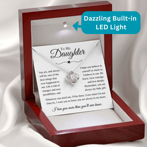 This elegant Love Knot necklace is more than jewelry—it's a heartfelt reminder that your daughter is never alone. Whether she's celebrating a milestone, facing a challenge, or simply needs to feel your presence, this beautiful piece keeps your love close to her heart.